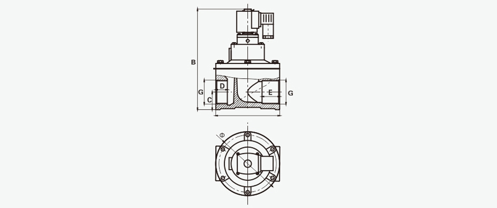 DCF-T型電磁脈沖閥為直通式電磁脈沖閥,其進氣口與出氣口的中心線在同一直線上,進氣口與分氣箱連接,出氣口與噴吹管連接。直通式電磁脈沖閥氣腔大、噴吹量大、安裝方便、清灰效果好。